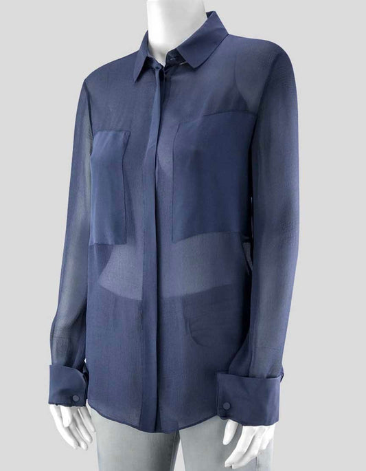 T By Alexander Wang Long Sleeve Sheer Blue Button Down Silk Blouse Collared Front Pockets Size Small