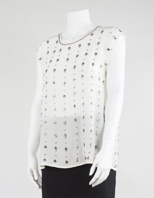 Joie Cream Silk Round Neck Capped Sleeve Blouse With Rhinestones Medium