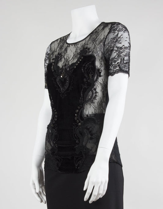 Amen Black Lace And Velvet Short Sleeved Tee - Small