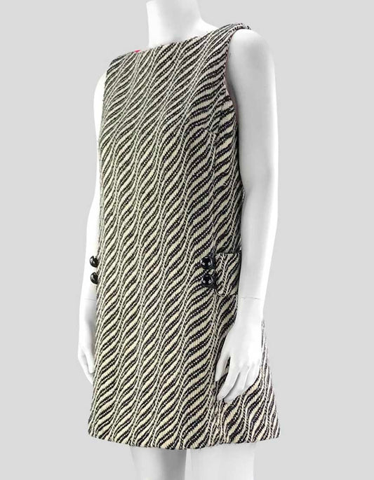 Milly Black And White Wool Shift Mini Dress With Bateau Neckline Button Detail At Waist Size 6 US