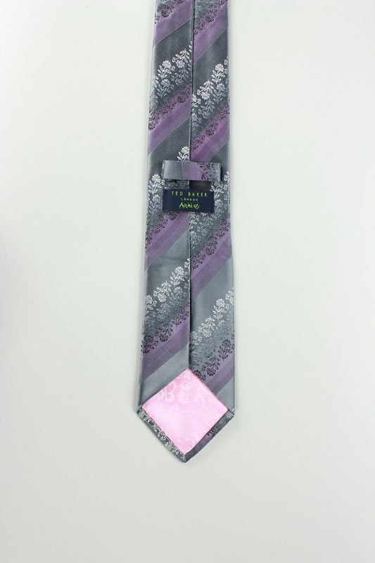 TED BAKER Grey Lilac and Purple Tie with Floral Design - One Size