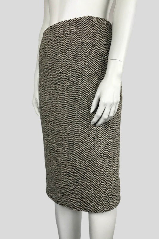 Black Brown And Cream Herringbone Lana Wool Pencil Skirt With Side Zipper Lined Size 12