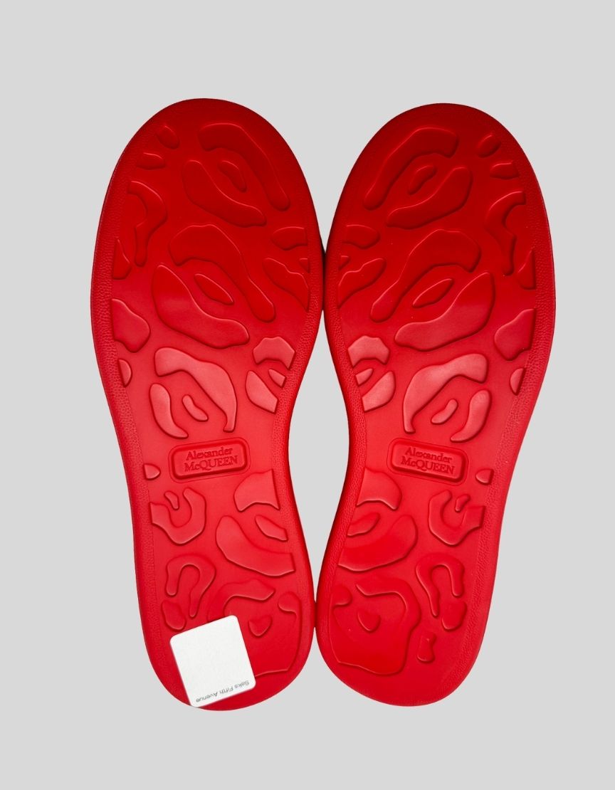 Description : ALEXANDER MCQUEEN Oversized Sneakers in Lust Red with Silver Metallic Heel Tab. Iconic oversized chunky sole design. All-over lust red leather construction. Contrasting metallic silver leather heel tab. Padded leather tongue and collar. Tonal red rubber sole with signature wavy tread pattern. Flat tonal laces. Alexander McQueen branding on heel. CONDITION: Excellent. New in box. Purchased for AMC's PARISH TV series wardrobe.