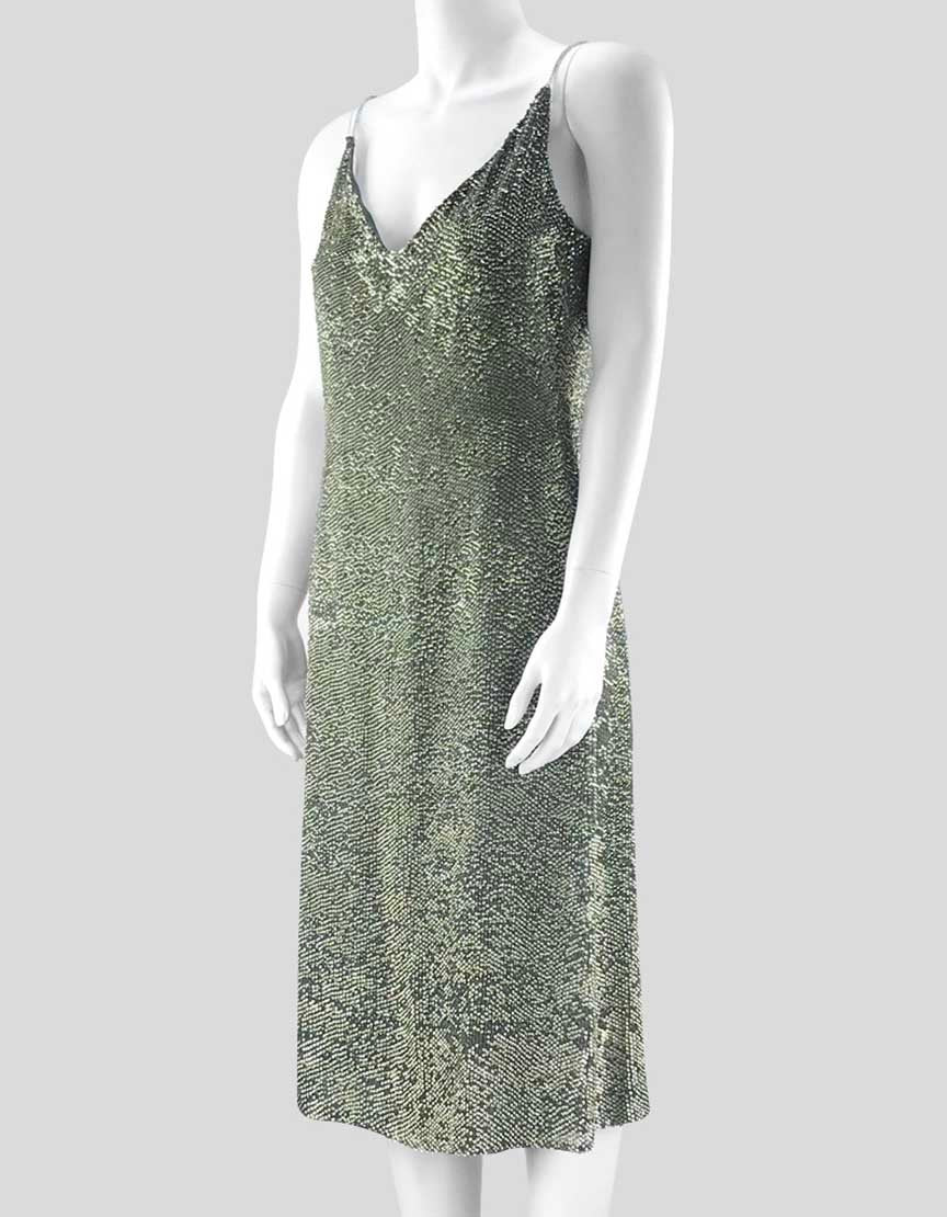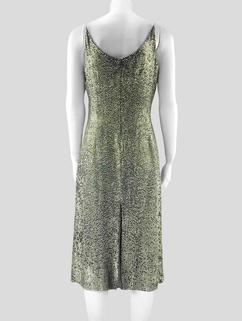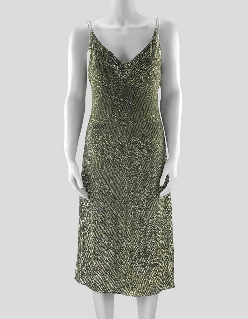 Description : Armani Le Collezioni women's forest green silver embellished evening dress with shoulder straps, v-neck and v-back. Concealed back zip closure. Back slit. Lined. CONDITION: Good. Gently Used. Slight wear throughout.