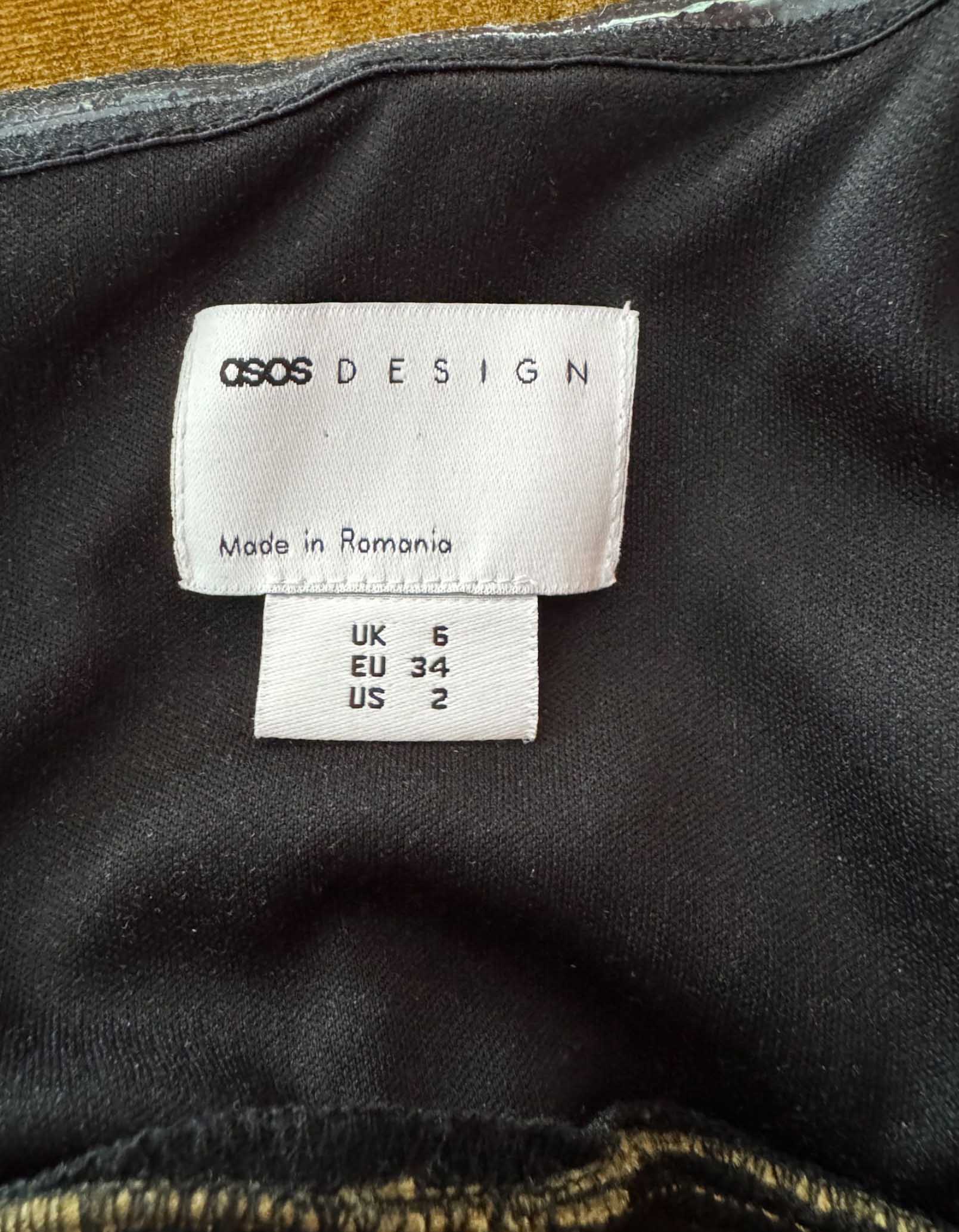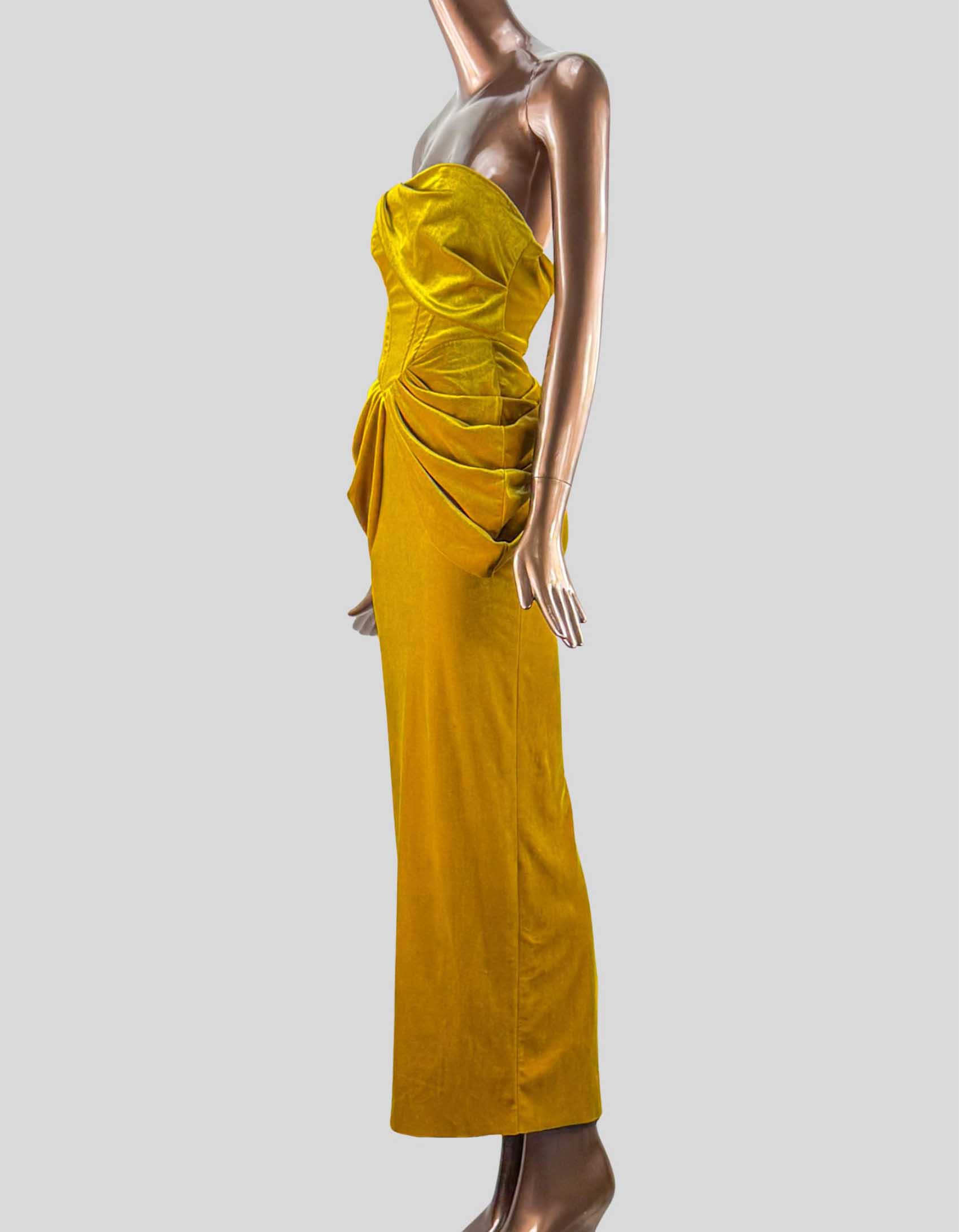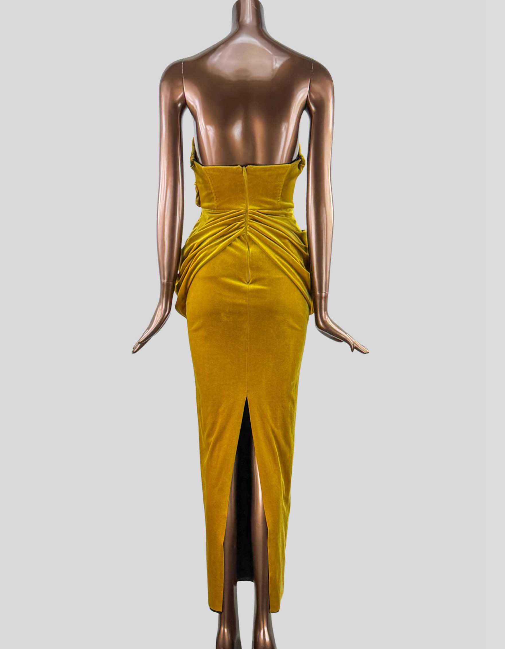 Description : ASOS DESIGN Strapless Velvet Corset Dress. Gold velvet gown, back slit, peplum waist detail, back zip closure. This item was purchased for the production of MAYFAIR WITCHES S1. CONDITION: Very. Slight dark spot on front (see images). SHIPPING & RETURNS: This item is final sale and is not returnable.