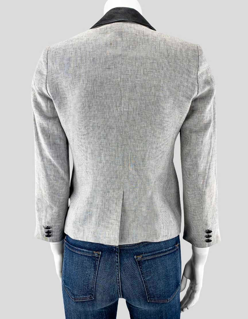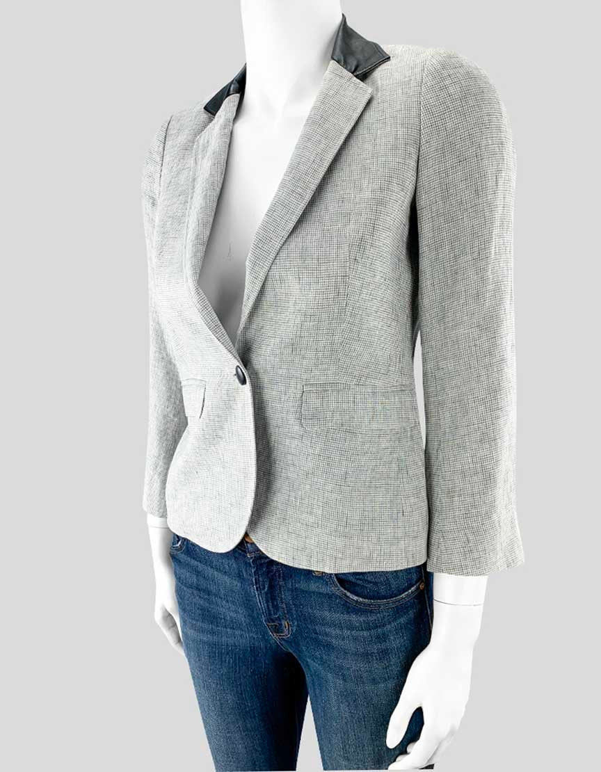 Description : BAND OF OUTSIDERS 'Boy' blazer in a subtle grey plaid with a black leather collar. This linen blazer is light, wearable and breathable. The black leather collar, black leather buttons at front closure and sleeves. Condition: Gently Used. Small scratch mark along the back of the collar.