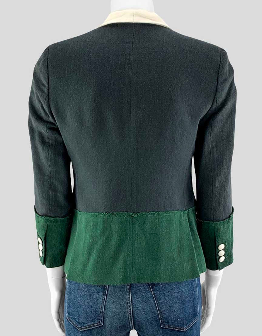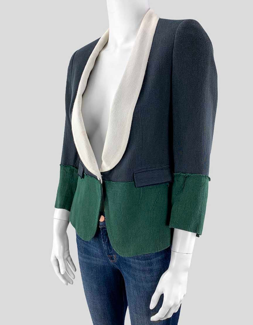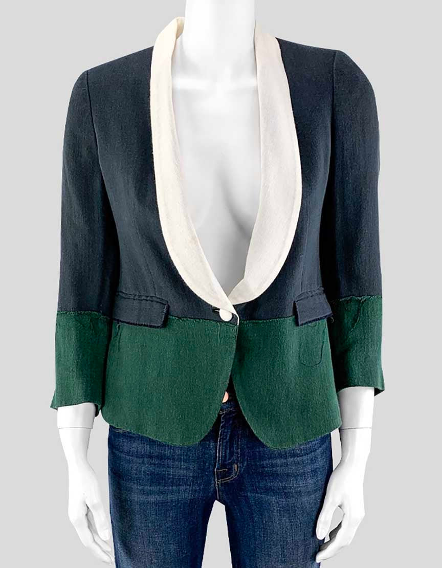 Description : Band of Outsiders blue and green cotton blazer with an off-white collar. Bottom half of blazer is modernized with a forest green color block. One button front closure and three-quarter length sleeves with three-button detail in off-white to match collar. This is a unique update to a a simple blazer. . Size: 1 | 2 US . Shoulders: 14.5" . Chest: 30" . Length: 19.5" . Sleeves: 18.5" . Color: Navy with Green and Off-White . Material: Cotton . Condition: Excellent, No visible signs of wear on outside. Lining has minor coffee stain. . Est. Retail: $650 . This item was generously donated by The Talk to support St. Jude Children's Research Hospital. (St.Jude)