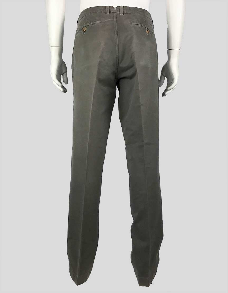 Description : BRUNELLO CUCINELLI olive chinos with four pockets, button fly front, and side waist button design. Condition: Gently Used. Light wear throughout. Two slight stains on front.
