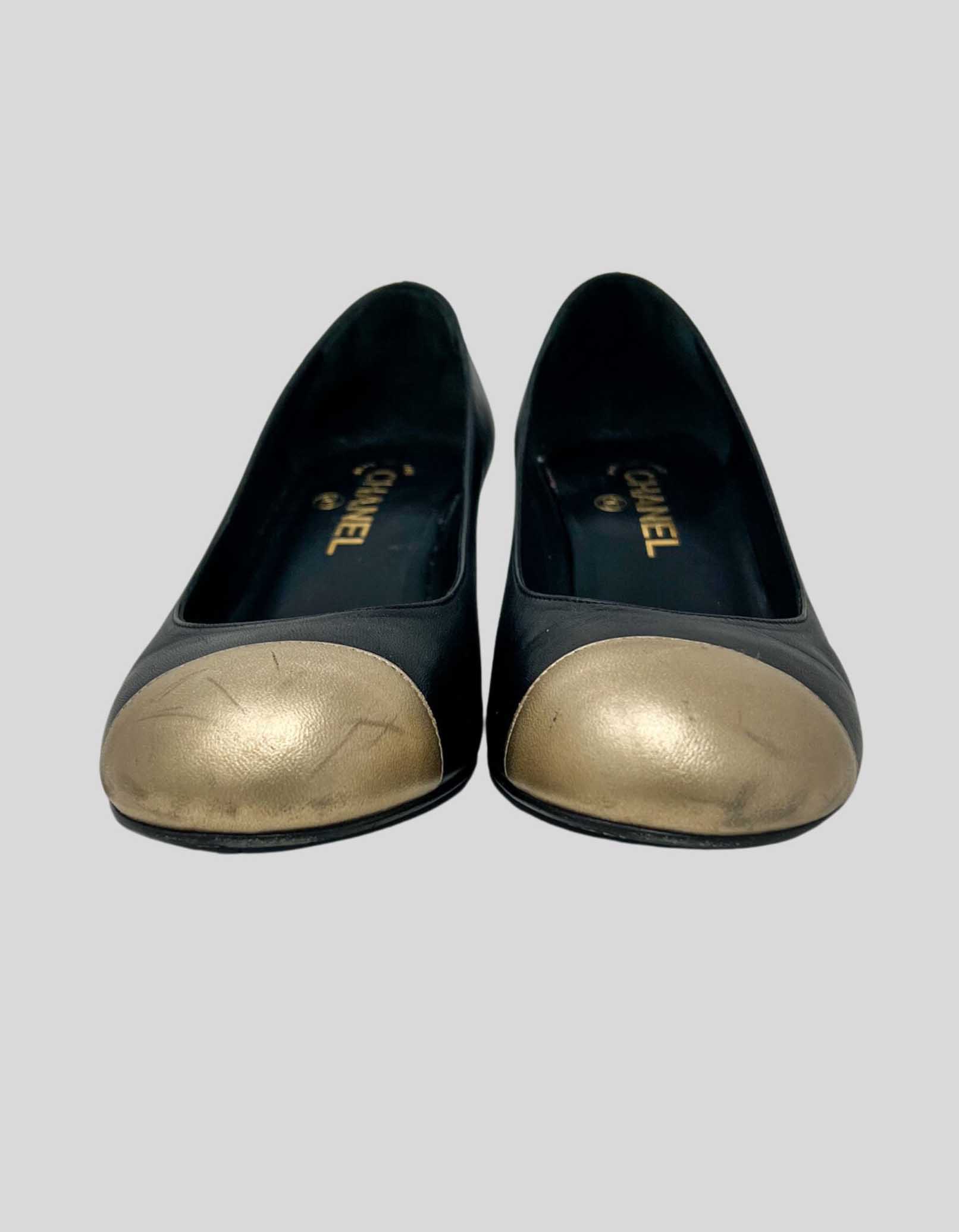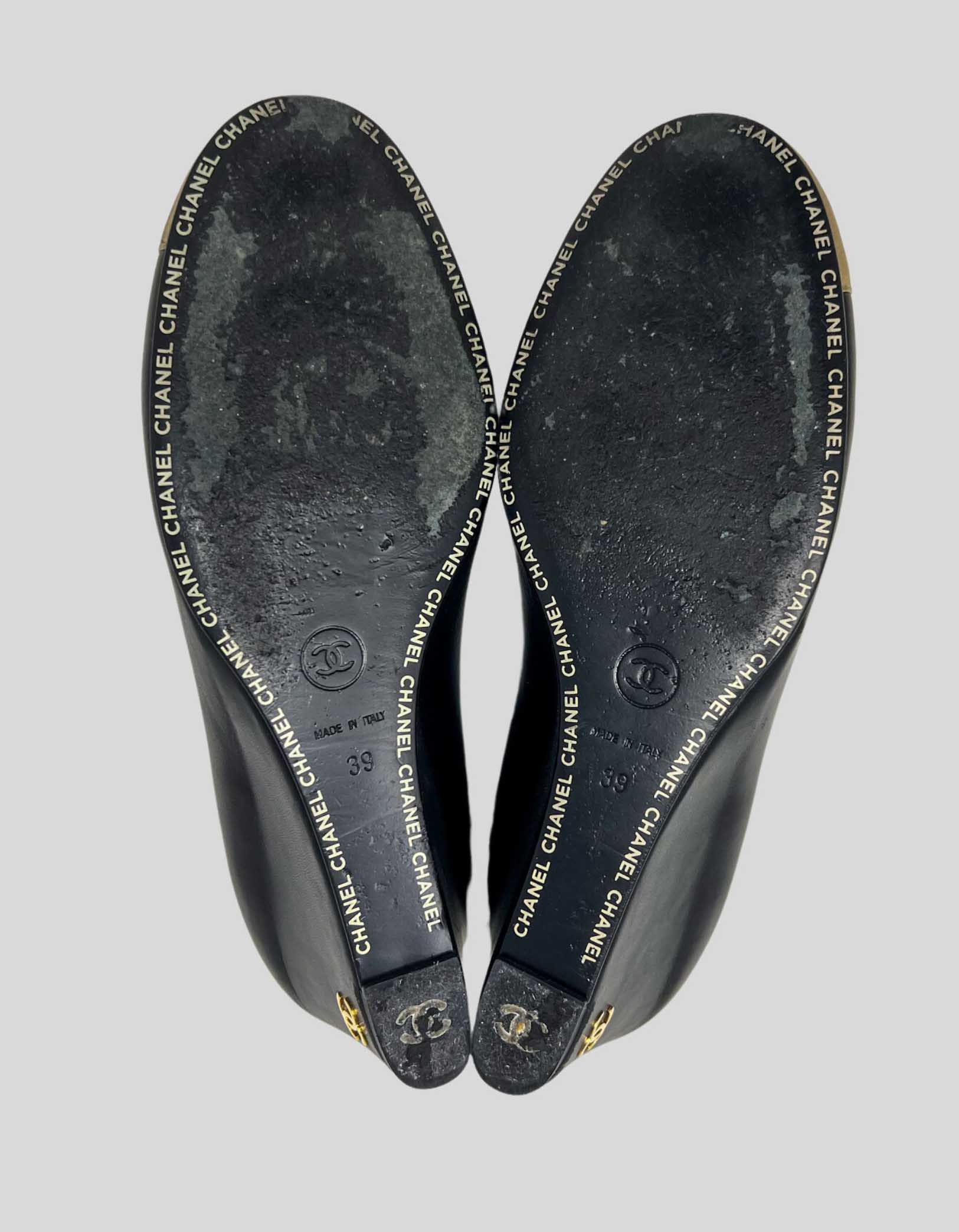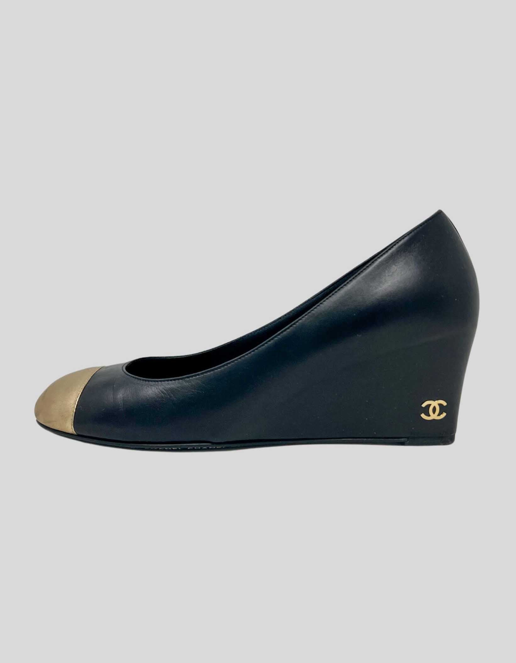 Chanel Black Wedge With Gold Tone Capped Toe With Chanel Emblem - 39 IT | 9 US