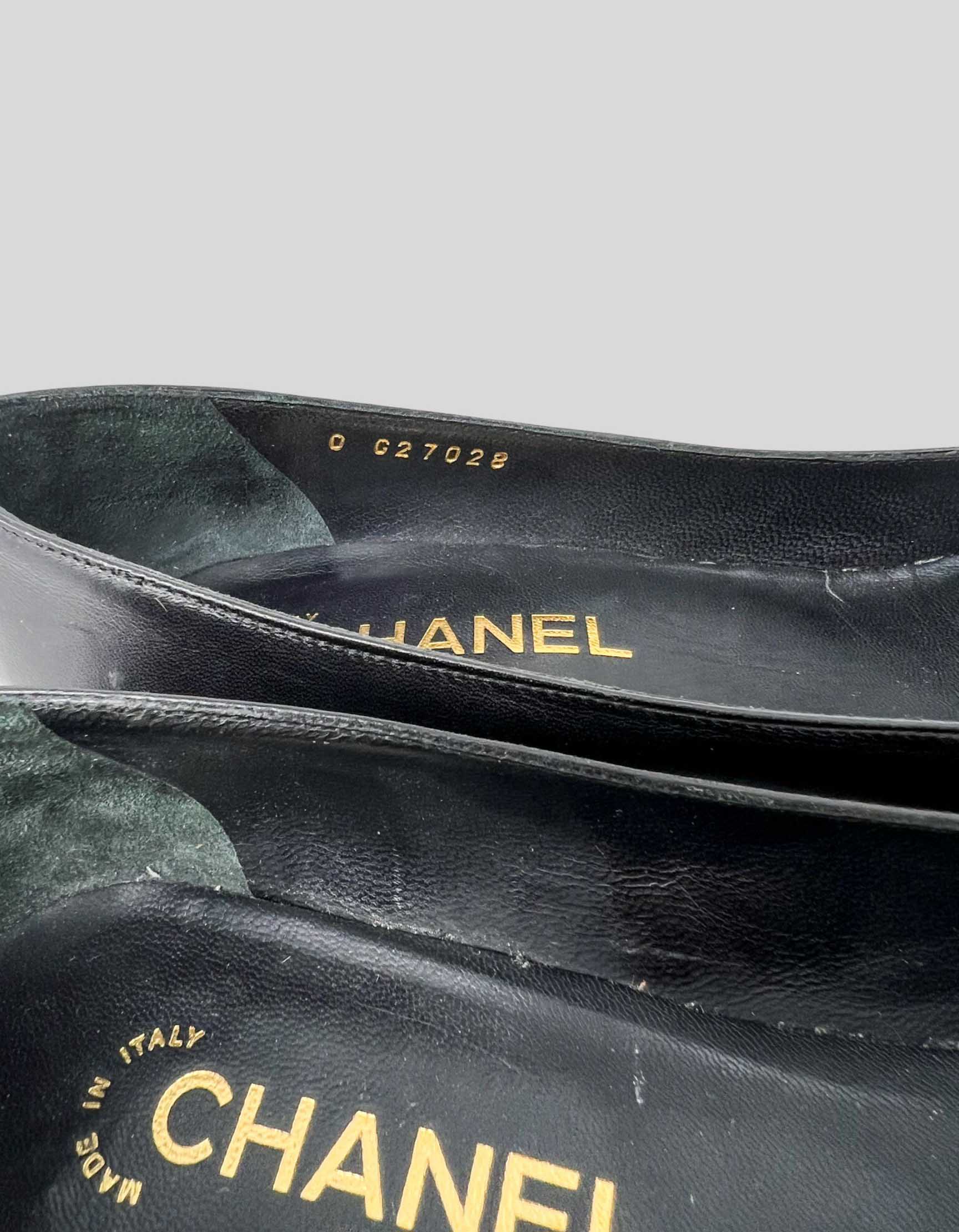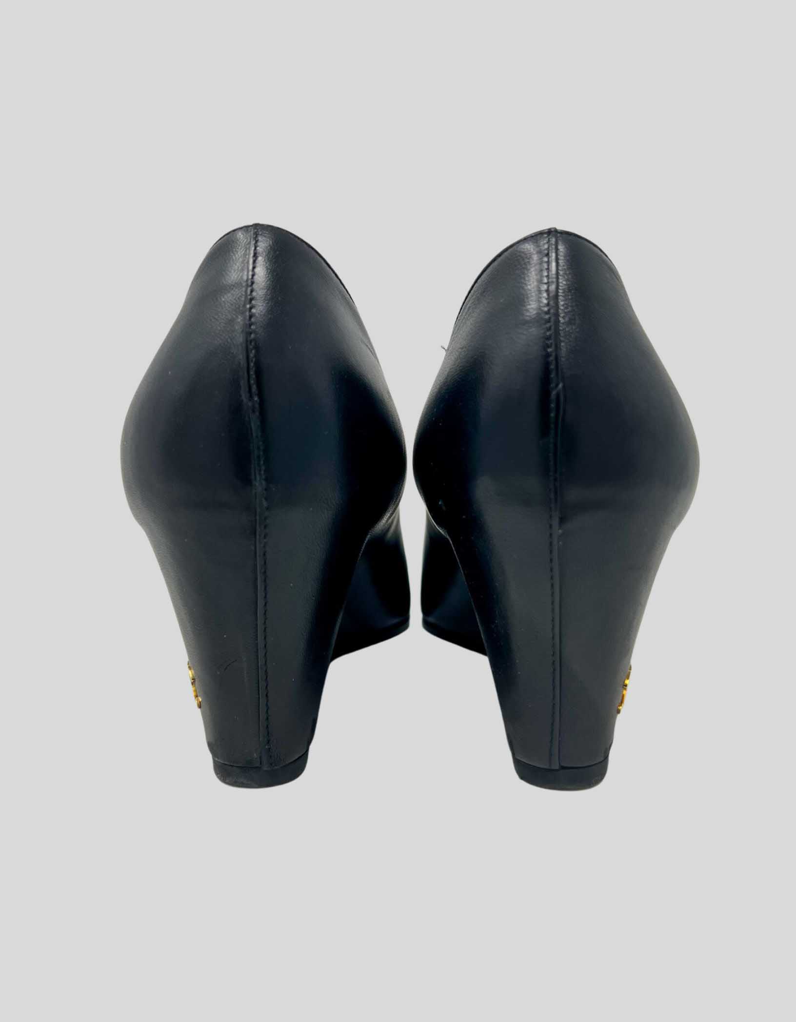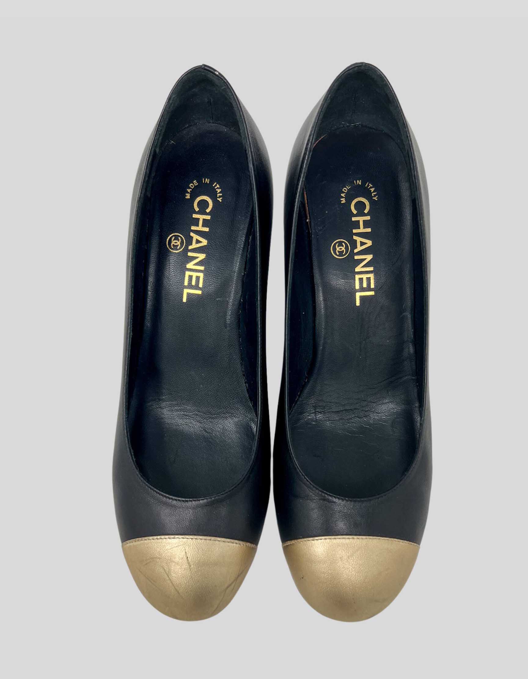 Chanel Black Wedge With Gold Tone Capped Toe With Chanel Emblem - 39 IT | 9 US