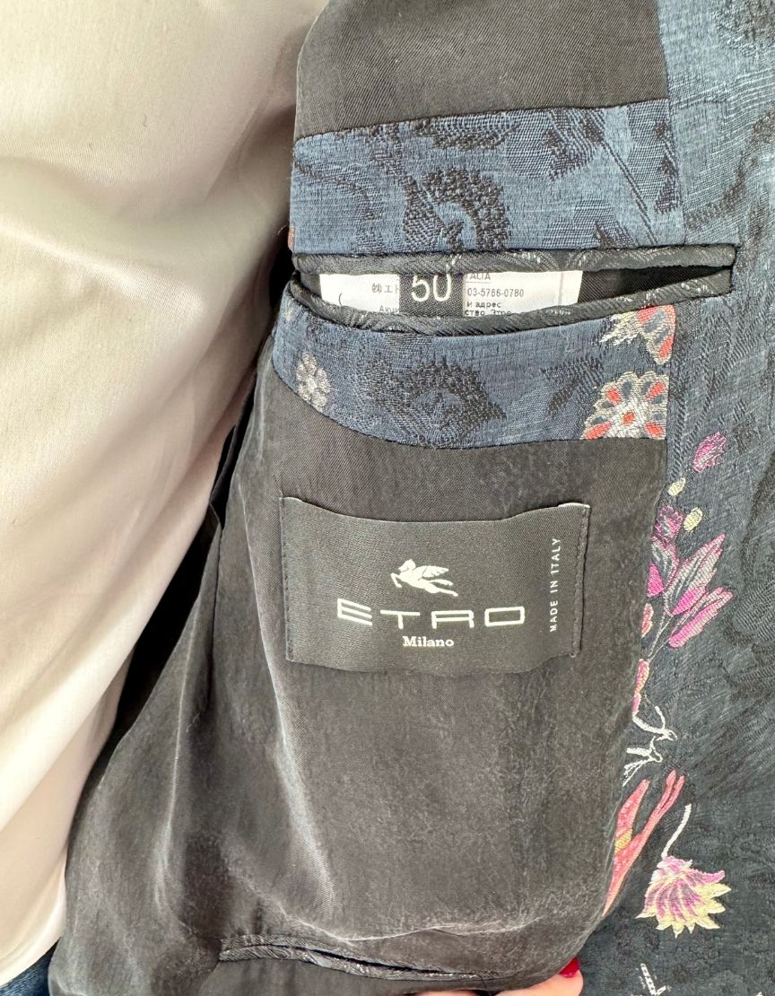 Description : ETRO statement blazer in dark grey with elaborate mythical bird and botanical embroidery throughout. Features intricate multicolored embroidery depicting winged creatures, floral branches, and paisley-inspired motifs in coral, gold, sage, and cream tones against a textured jacquard background. Single-button closure, notch lapels, welt breast pocket, flap pockets at waist, four-button working cuffs, and double vented back. Fully lined in signature Etro paisley print. CONDITION: Excellent. Worn on screen by character Zenzo in AMC's PARISH TV series.