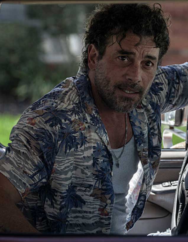 Description : FAHERTY classic Hawaiian shirt featuring vibrant tropical print with blue palm trees and orange hibiscus flowers on cream background with abstract wave pattern. Features button-front closure, camp collar, chest patch pocket, short sleeves with relaxed cuffs, curved hem. Lightweight construction with signature "A Guarantee of Quality" label. Slight distress throughout fabric adds authentic character. CONDITION: Excellent. Worn on screen by character Colin in AMC's PARISH TV series.