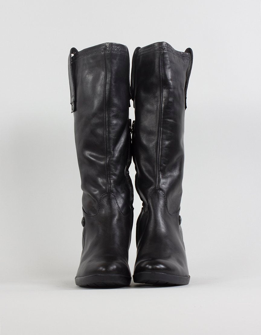 Description : G STAR RAW black leather, calf height, round toe boots with strap design at top, wooden heels and side zipper. CONDITION: Like New. No visible signs of wear.