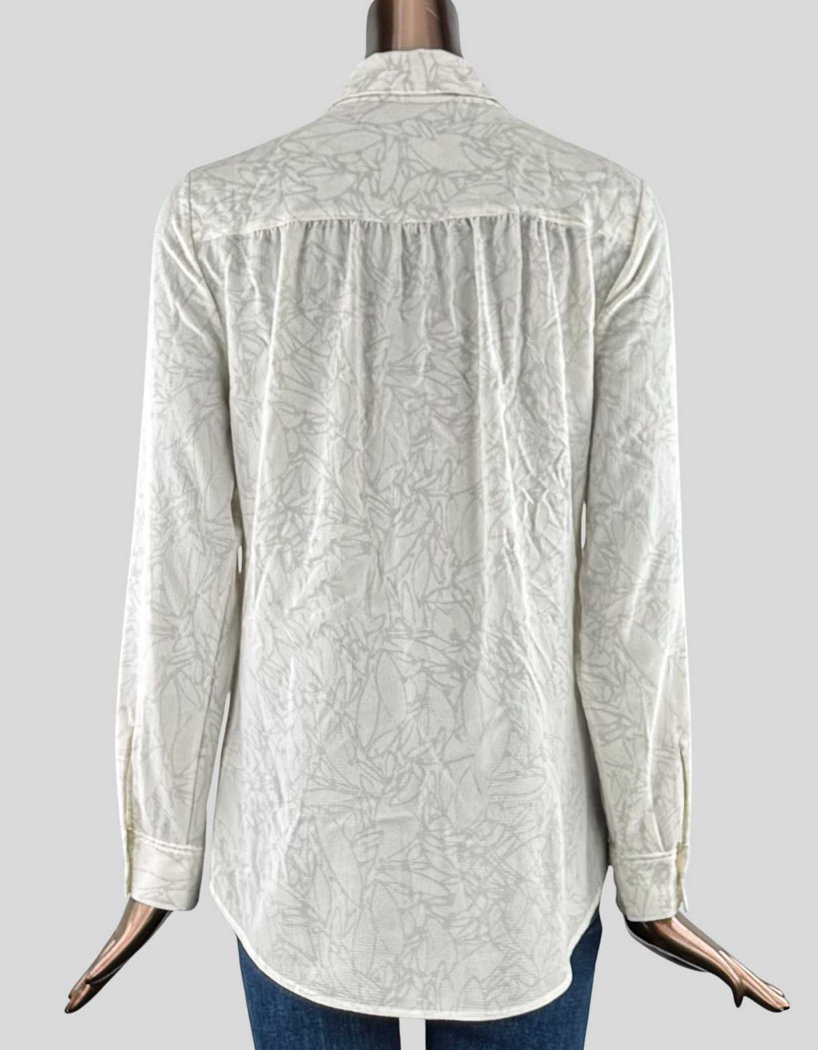 Description : H HALSTON Long Sleeve Cream Patterned Blouse. Button-front closure, long sleeves with button cuffs, and a cream pebble print. CONDITION: Excellent. Like new. Worn in Adventures in Love & Birding movie.