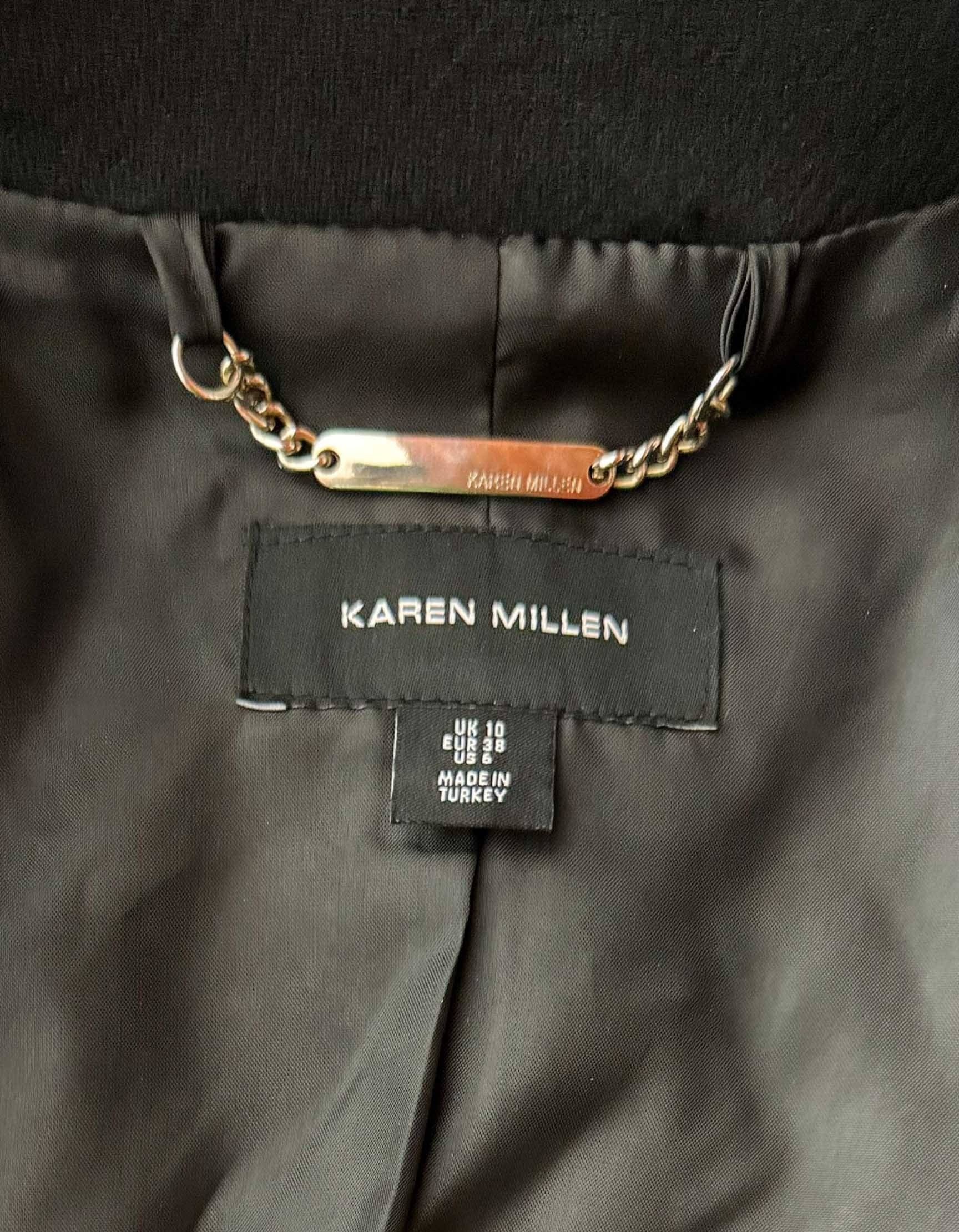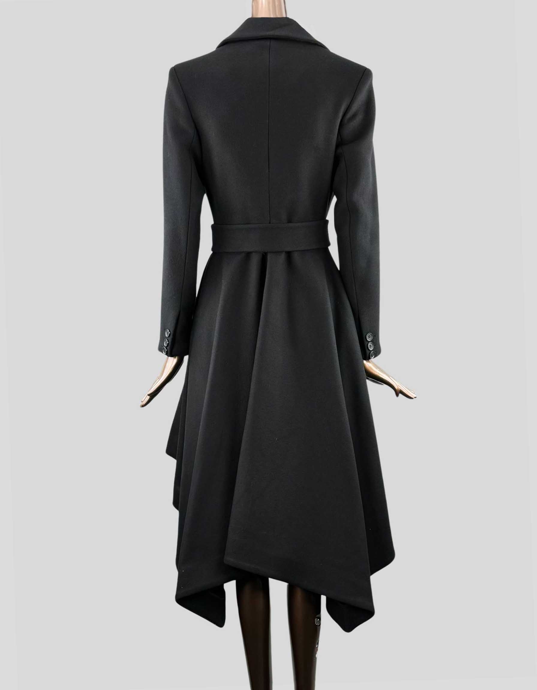 Description : KAREN MILLEN Dress Coat in black. Designed and tailored to create a most feminine silhouette. Fluid collar to waist. Double-breasted front. Full-length sleeves. Two side pockets. Cinched waist with fabric tie. Hi-lo full-pleat skirt. Lined on top half. CONDITION: Excellent. No visible signs of wear. Seen in HOLIDAY TOUCHDOWN: A Chiefs Love Story.