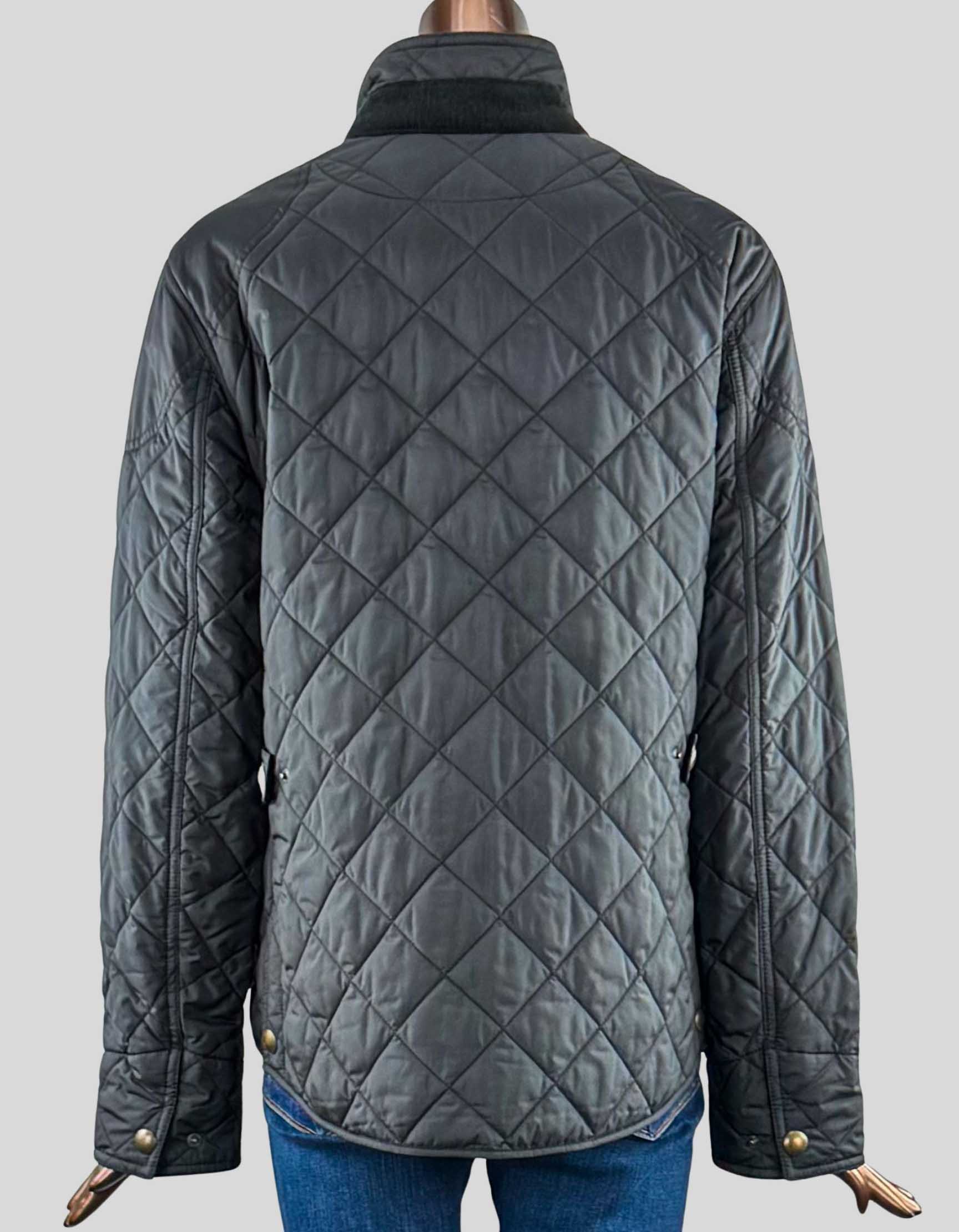 Description : LAUREN RALPH LAUREN Sport Quilted Barn Jacket. Black, quilted, patch pocket, stand collar, front pockets, zip and snap front, barn jacket with black corduroy trim at collar, under arms, and at wrists. CONDITION: Excellent. Like new. No visible signs of wear.