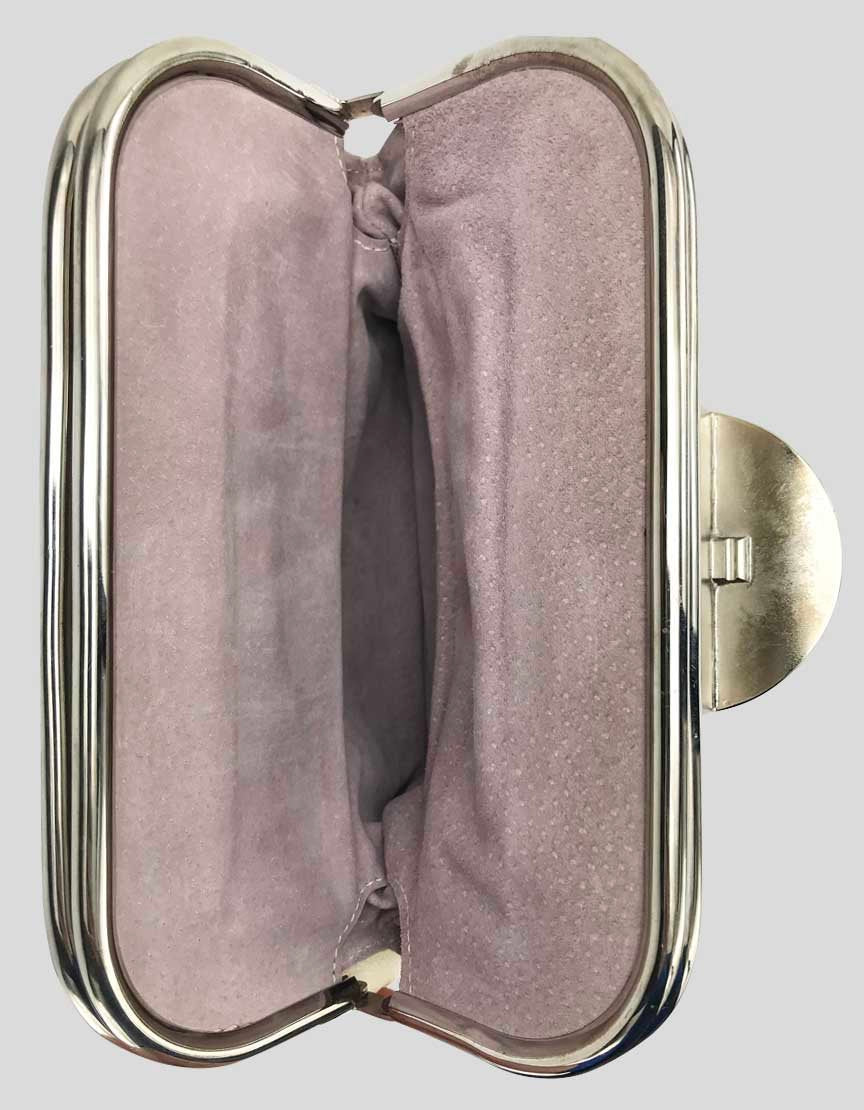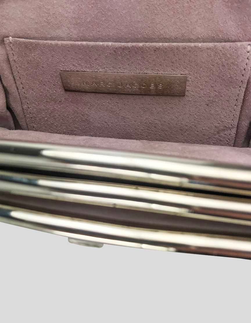 Description : Marc Jacobs Ivory Chevron Frame cutch with quilted leather and silver-tone hardware. Single flat leather handle at back. Mauve suede lining. Three compartments. Single interior slit pocket and flip lock closure at top frame. . Height: 6" . Width: 9" . Depth: 1" . Color: Ivory . Material: Leather, Silver-tone hardware and Suede interior . Condition: Very Good. Light residue at hardware and slight wear on. . Est. Retail: $495 . A minimum of 5% of the purchase price from this item will be donated to Children's Hospital Los Angeles. (CHLA)