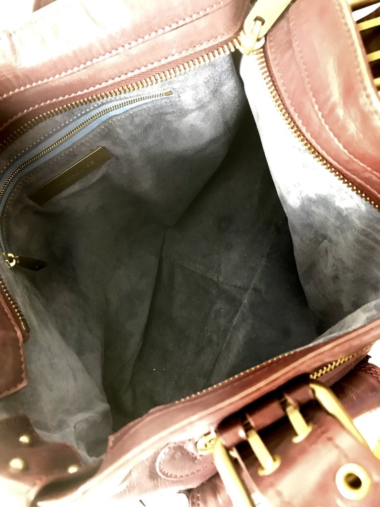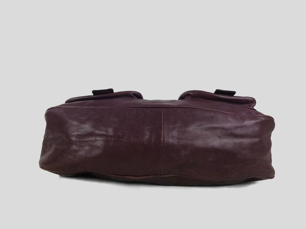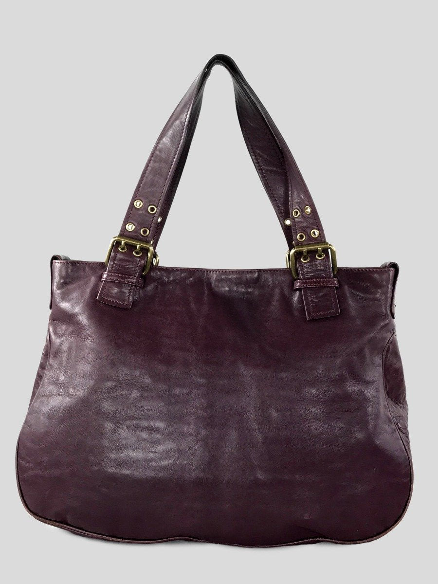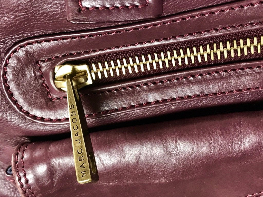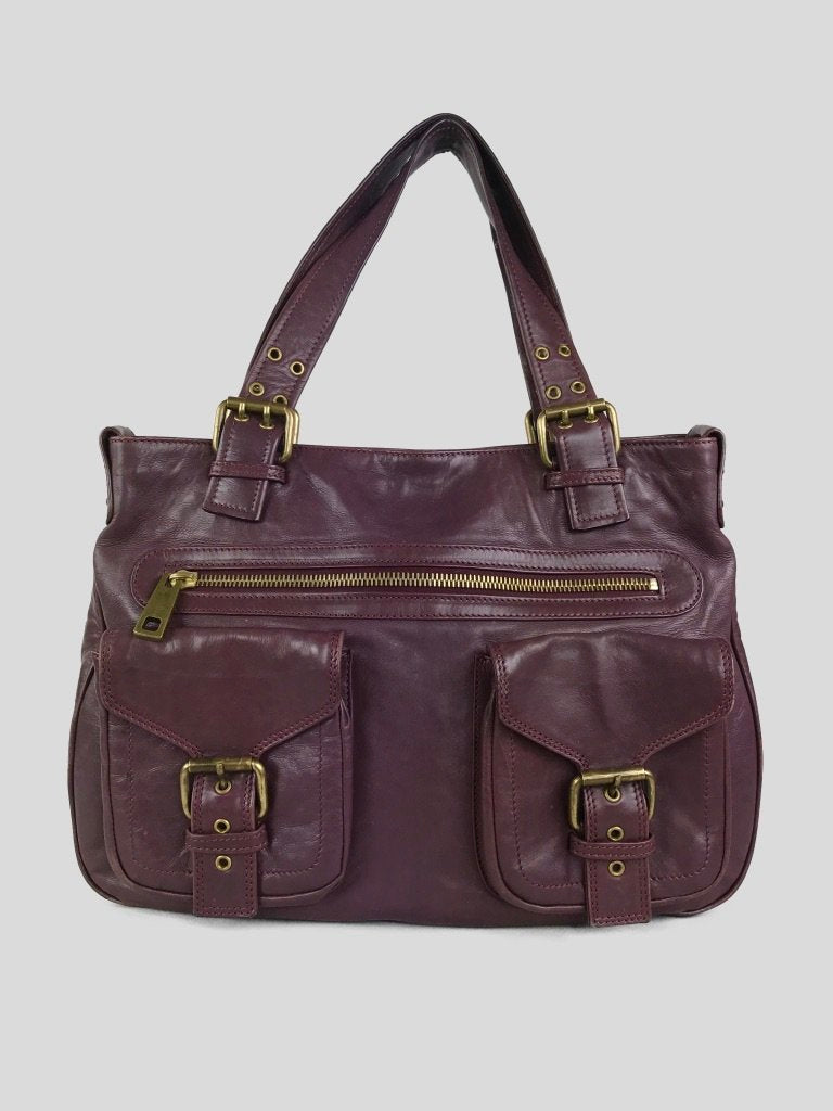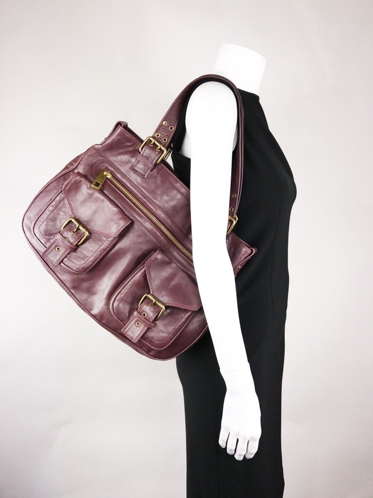 Description : Marc Jacobs Stella tote bag with front buckle and zipper pockets in burgundy leather with bronze-tone hardware throughout. CONDITION: Gently Used. Minor wear at base of bag.
