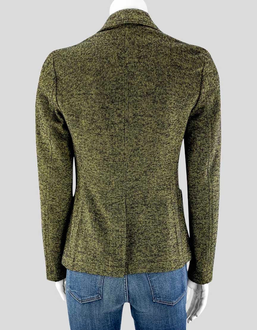 Description : MASSIMO ALBA olive tweed blazer with green and black stitching. Features three front buttons, two front pockets, and a pocket on the left breast. Condition: Excellent. No visible signs of wear.