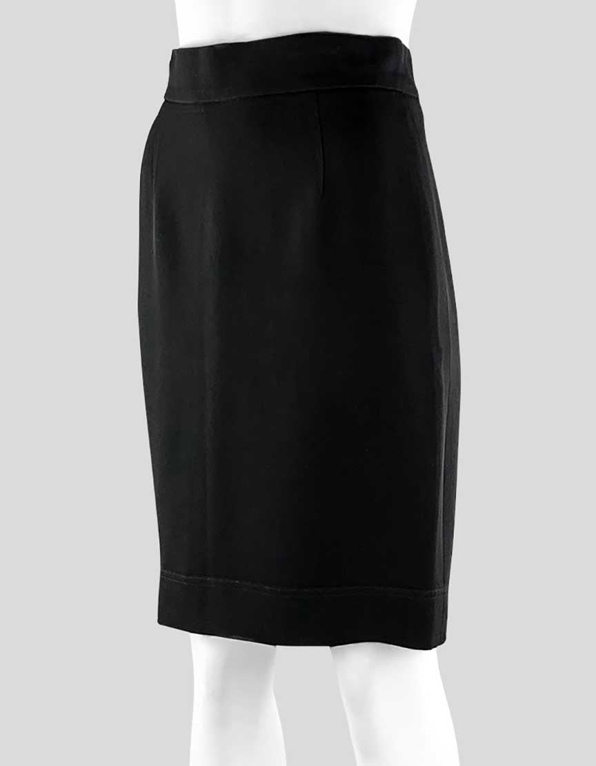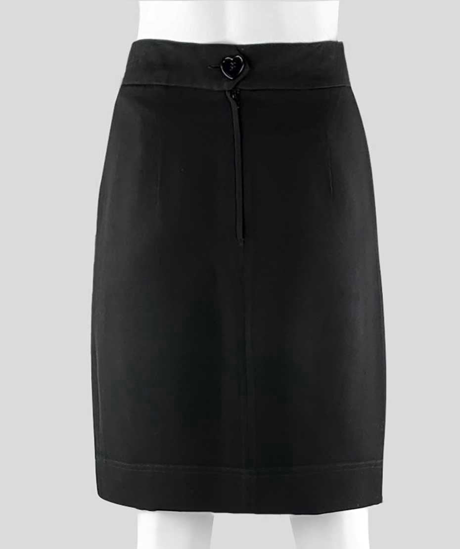 Description : MOSCHINO CHEAP & CHIC black knee-length pencil skirt. Two inch waist band. Concealed back zipper with heart-shaped black button closure. Lined. Condition: Good. Moderate wear throughout