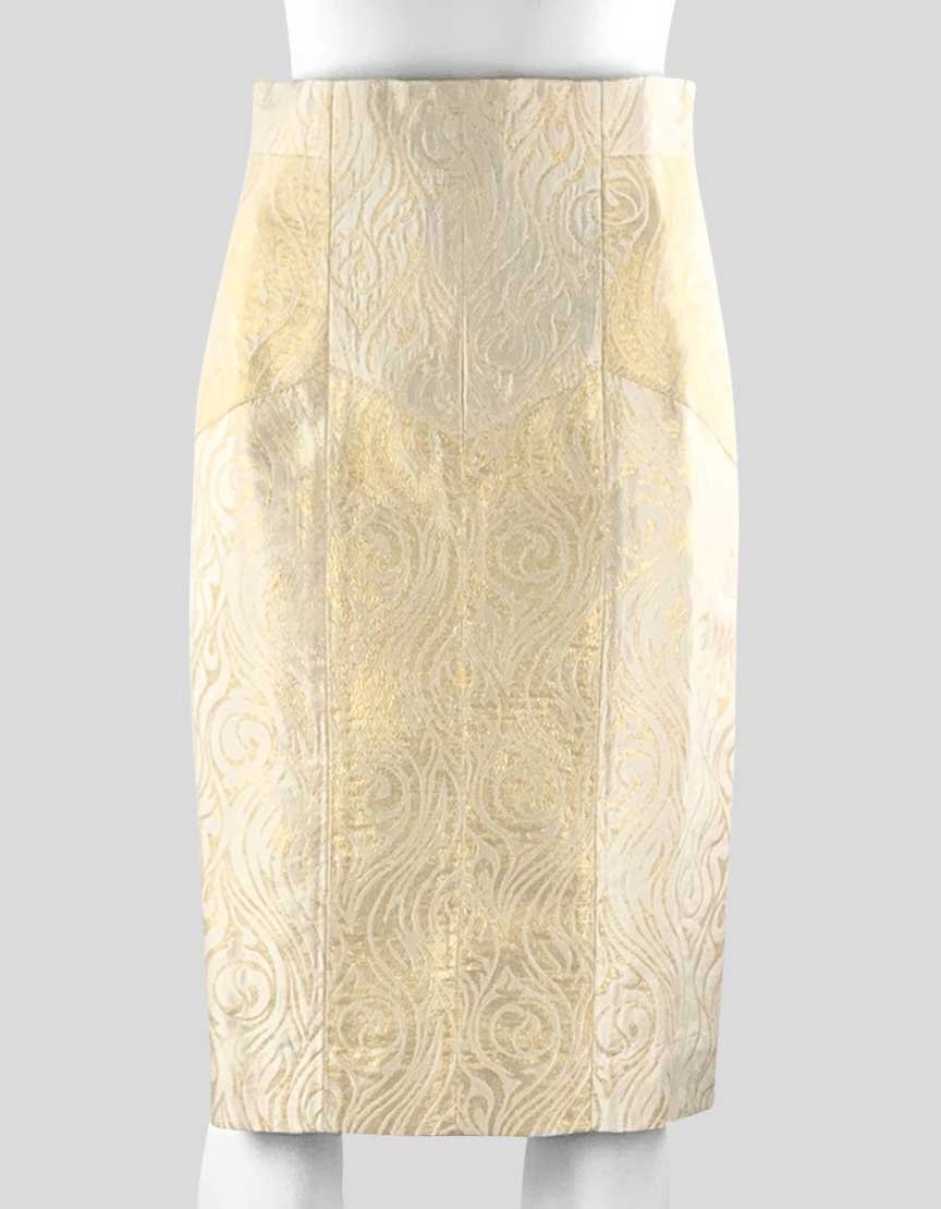 Description : Nicole Miller gold jacquard evening skirt with side paneling. Exposed rear zipper and back slit. Lined. . Size: 4 US . Waist: 29" . Length: 24.5" . Back Slit: 5" . Color: Gold . Material: 67% Viscose 20% Silk and 13% Lurex . Lining: 100% Acetate . Condition: Very Good. No visible signs of wear. . Est. Retail: $265 . A minimum of 5% of the purchase price from this item will be donated to the Breast Cancer Research Foundation