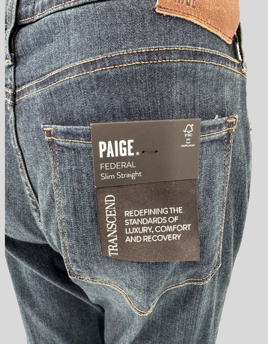 Description : PAIGE Federal slim straight jeans in "Banner" dark blue wash. Modern slim straight fit with slight ease at the hip, loosely fitted through the thigh, and straight from the knee down. Made from TRANSCEND denim with premium stretch and recovery technology. Five-pocket styling with zip fly and button closure. CONDITION: New with Tags. Never worn. Purchased for AMC's PARISH TV series wardrobe.