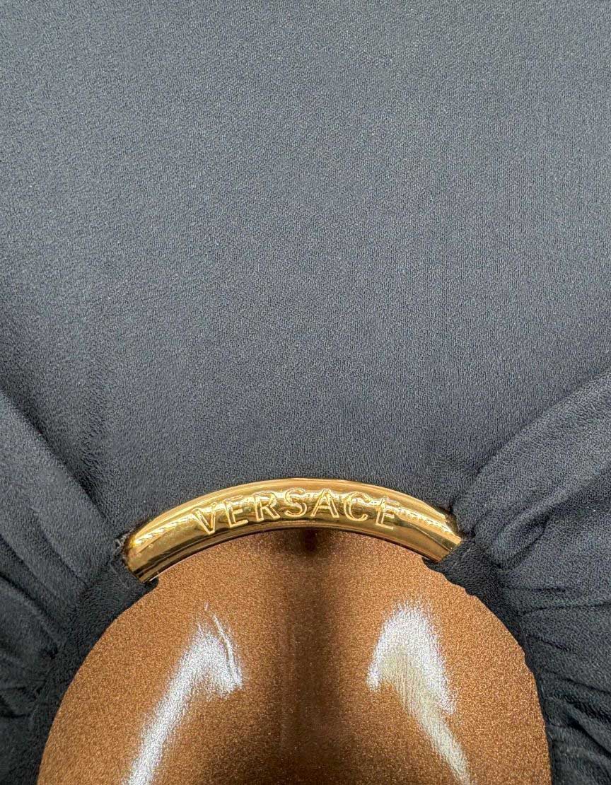 Description : Authentic Versace long-sleeve bodysuit in black with signature gold Medusa hardware cutout detail. Features gathered fabric radiating from center gold-tone ring, creating dramatic draping effect. Thumb holes at cuffs. Back zip closure. CONDITION: Very good. New with original tags. Small seam separation at center back (see image). Purchased for AMC's PARISH TV series wardrobe.