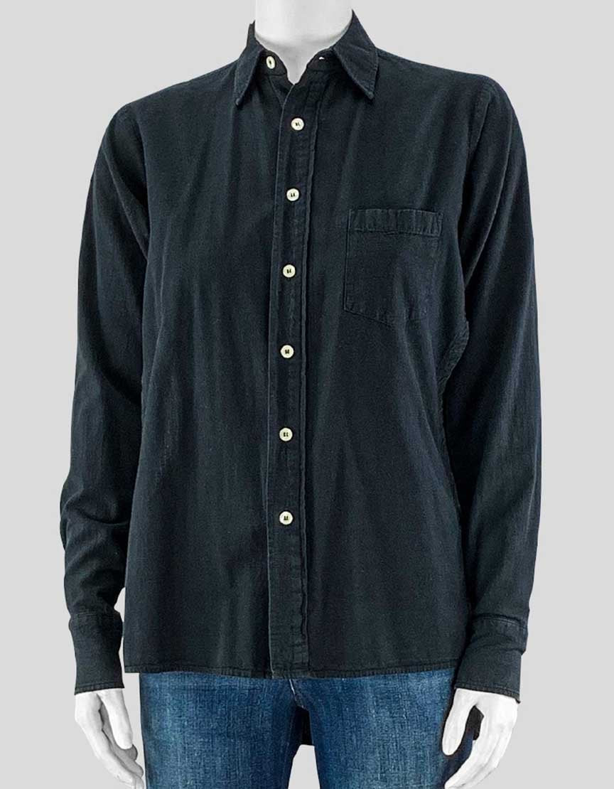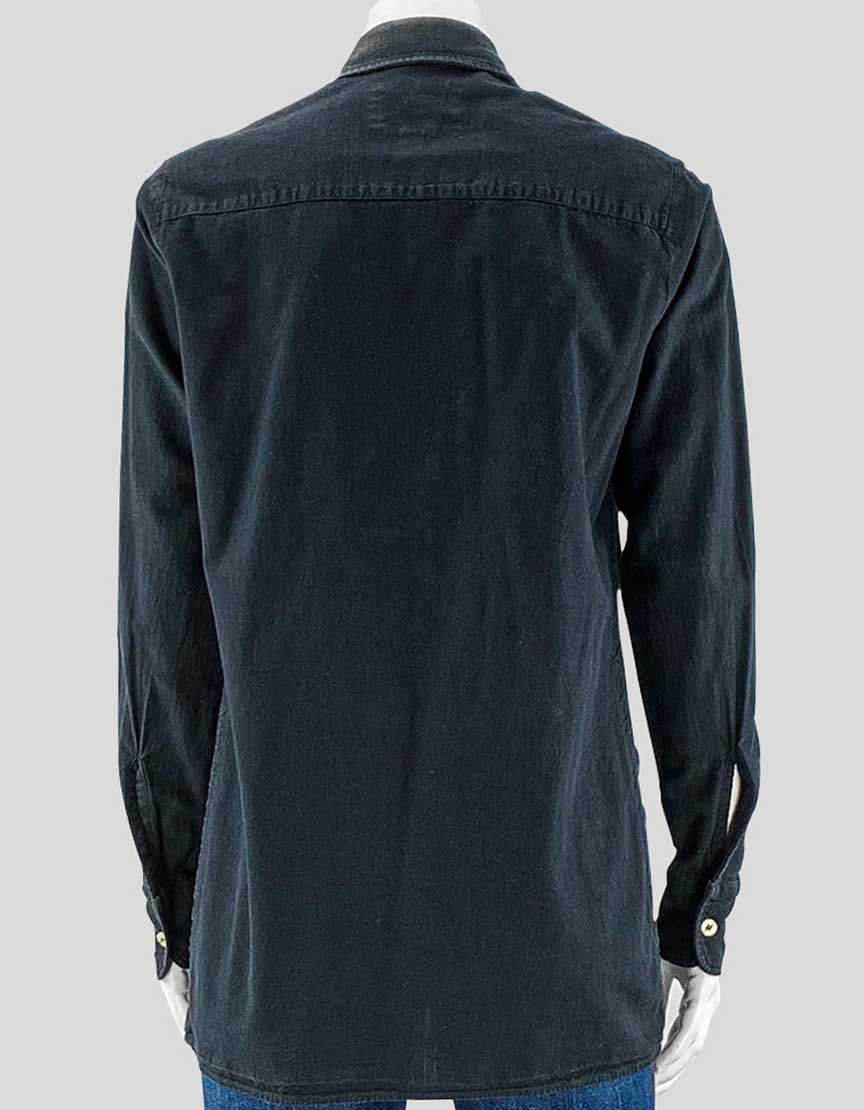 Description : R13 black button-down with high rise slits along the sides and faded look throughout. A flattering style that adds a bit of edge to a staple black button-down. . SIZE: X-Small . SHOULDERS: 15" . CHEST: 34" . LENGTH: 23" . SLEEVES: 23" . COLOR: Black . MATERIAL: Cotton . CONDITION: Like new. . EST. RETAIL: $345