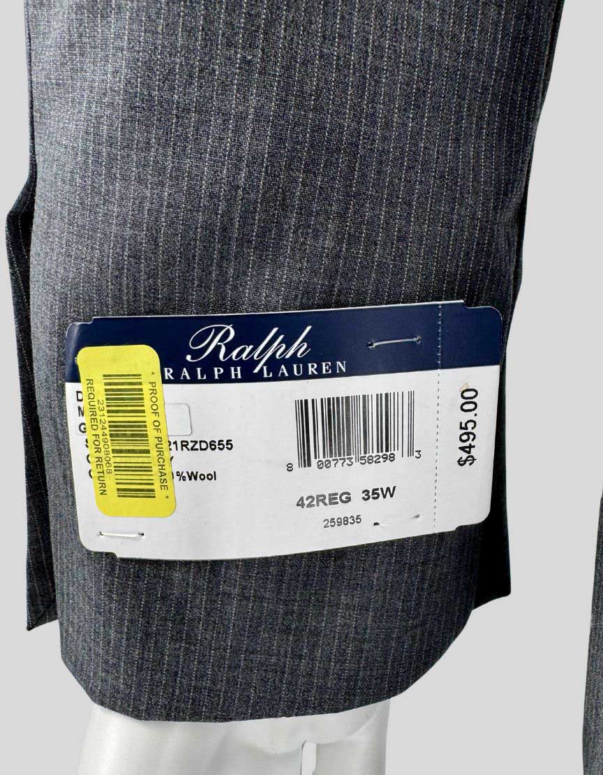 Description : RALPH LAUREN two-piece suit in charcoal grey with subtle pinstripes. Made from 100% wool, this classic suit features a 42 Regular jacket with notch lapels, two-button closure, and flap pockets, paired with flat front dress pants in size 35 waist. Refined pinstripe pattern. Traditional fit. CONDITION: Pristine. New with tags. Purchased for AMC's PARISH TV series wardrobe.