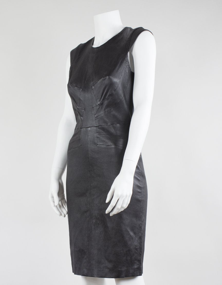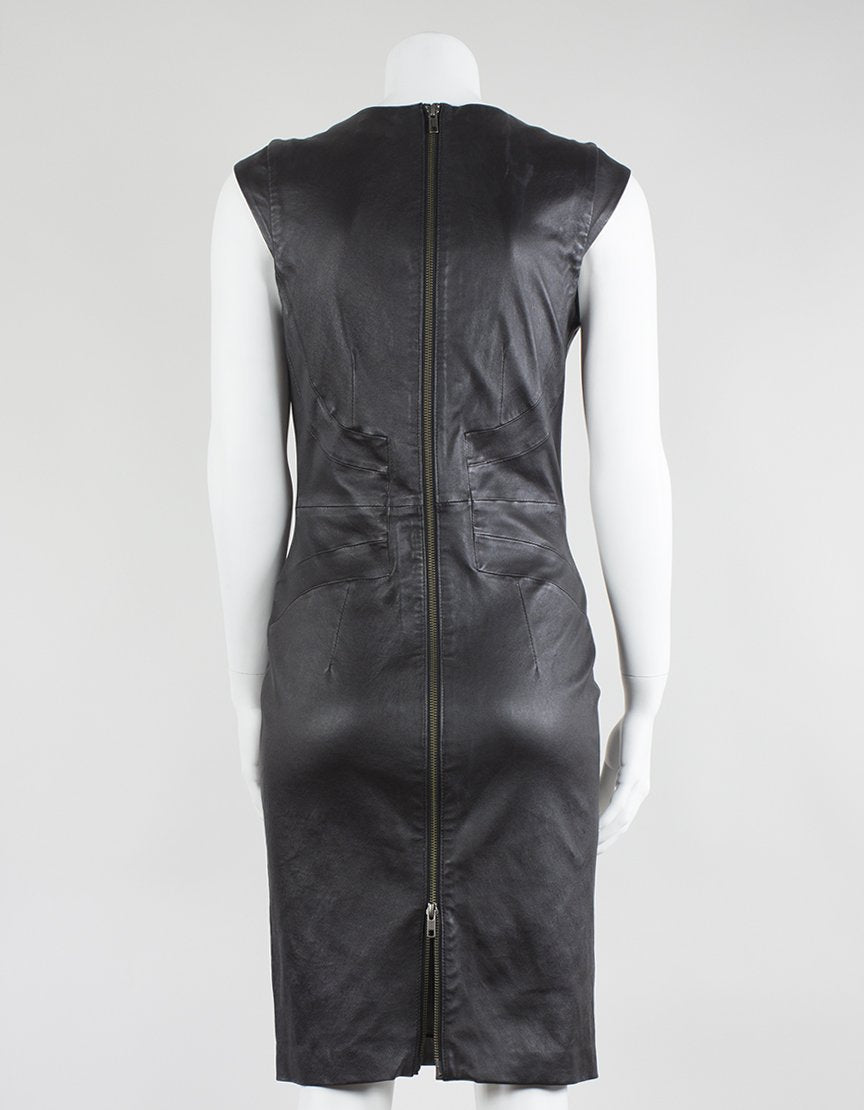 Description : REBECCA VALLANCE black leather, capped sleeve, shift dress with exposed zipper in back. CONDITION: Excellent. New with Tags. No visible signs of wear.