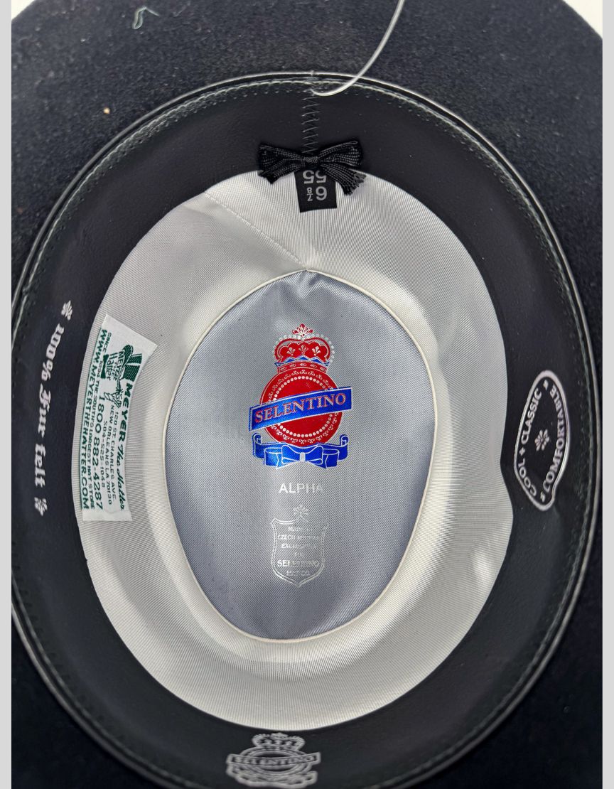 Description : SELENTINO Alpha Black Felt Fedora with Feather Accent. Classic homburg/fedora style also known as "Godfather" hat. Black grosgrain ribbon band with bow detail. Removable natural pheasant feather accent. Luxury fur felt construction. Interior leather sweatband with Selentino branding. CONDITION: Excellent. New with original tags. Purchased for AMC's PARISH TV series wardrobe.