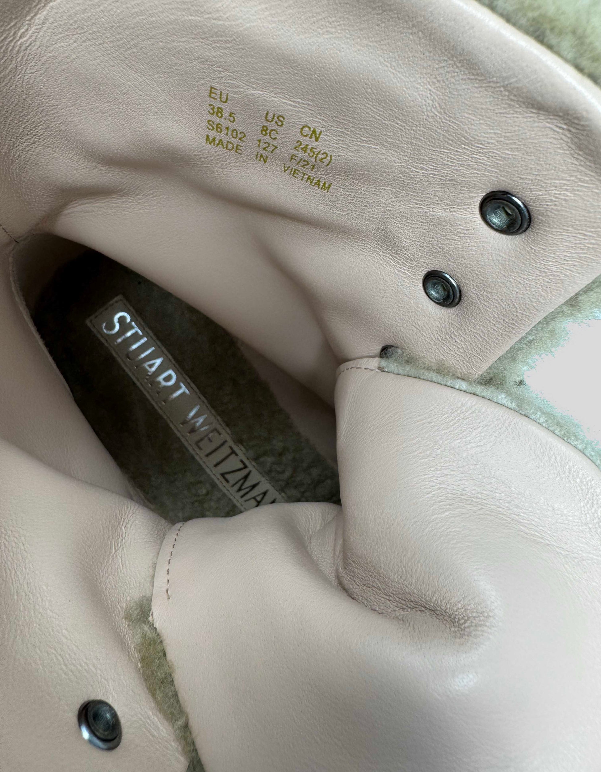 Description : STUART WEITZMAN shearling lug sole combat boots in luxurious beige. Features plush genuine shearling upper, lace-up front closure, cushioned block heel with chunky lug sole platform, beige rubber ridged sole. Cozy shearling lining throughout for warmth and comfort. Contemporary take on the classic combat boot with elevated luxury materials. SW branding on sole. CONDITION: Excellent. Worn once. Minor wear on soles with slight mark on side of sole. Worn in AMC's PARISH TV series.