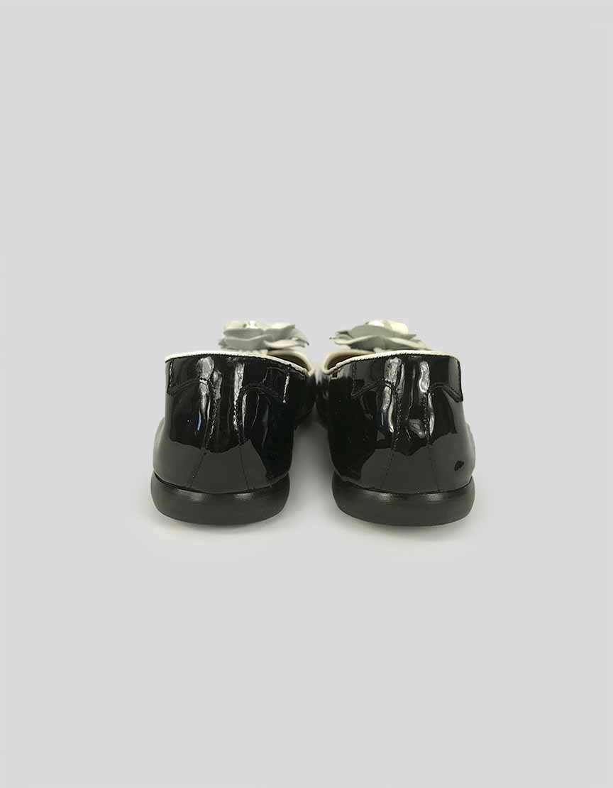 Description : TARYN ROSE black patent leather ballerina flats with white patent leather floral design at toe. Leather soles. Condition: New. No visible signs of wear.