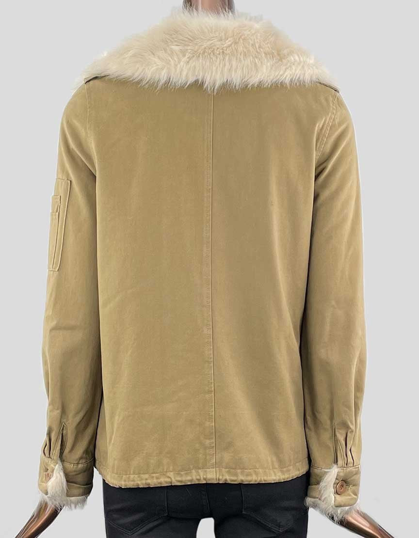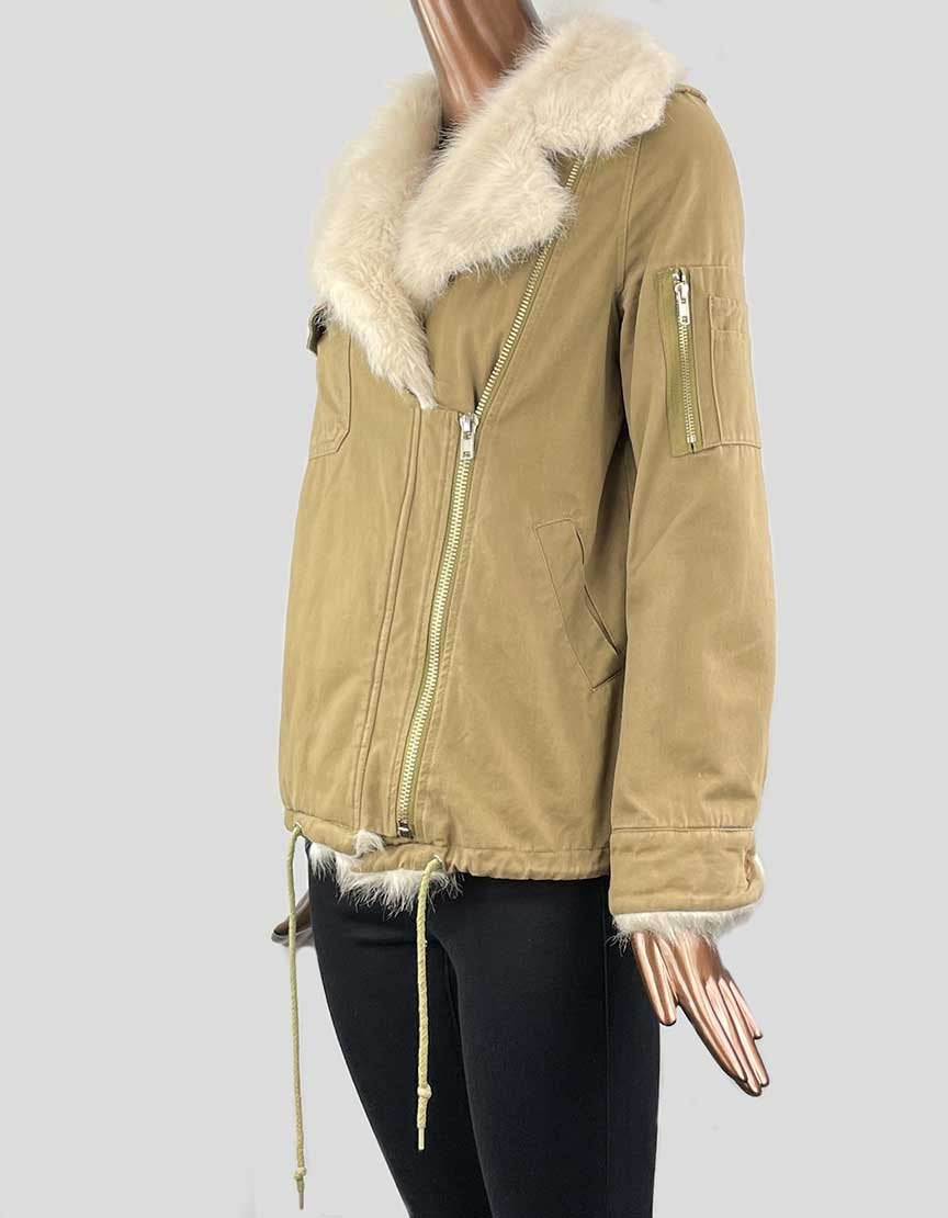 Description : UNIF Sherpa Jacket featuring faux fur oversized collar, with fur detail on cuffs and down the front. Three front pockets, one with button closure. One zip-closure sleeve pocket. Drawstring on bottom hem and one-button closure on sleeve cuffs. . This item is from the wardrobe of Golden Globe-nominated film, The Prom. . CONDITION: Gently Used. Slight wear throughout.